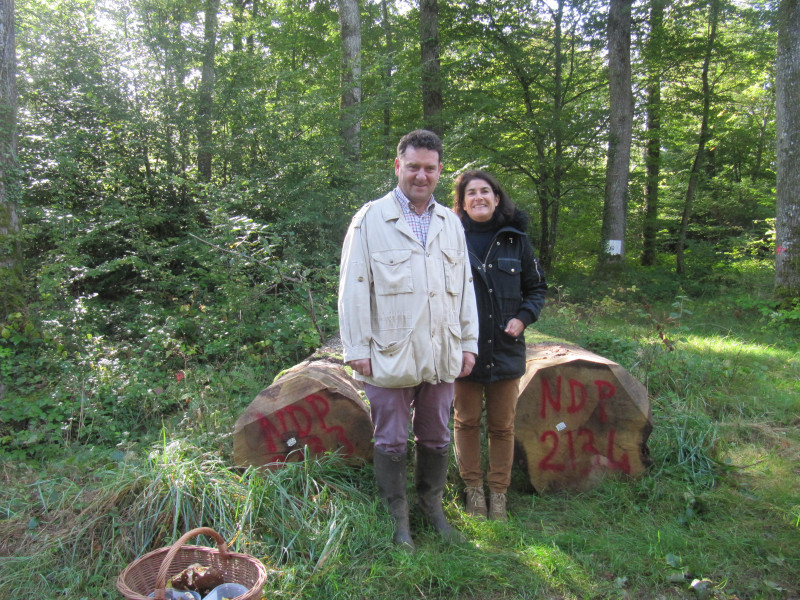Au détour d'une sente débouchant sur une belle allée forestière, nous avons ressenti une belle émotion en voyant couché sur le sol deux magnifiques chênes sur le tronc desquels été inscrite, à l'encre rouge, la mention NDP ; notre ami Alex ayant traduit cette mention comme Notre Dame de Paris, nous avons demandé à nos deux hôtes de nous éclairer sur cette inscription et ces derniers nous ont confirmé que ces deux chênes âgés d'environ 180 ans, offerts par M. WILHELEM, étaient destinés à la reconstruction de la flèche de Notre Dame de Paris, ce qui rassénéra toute la troupe et donna lieu à quelques photos souvenirs.