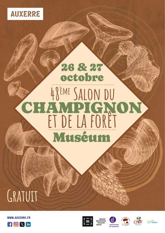 Le samedi 26 de 10h00 à 12h00 et de 14h00 à 18h00, et dimanche 27 octobre 2024 de 10h00 à 12h00 et de 14h00 à 17h00, la S.M.A. avec le Muséum d'Auxerre organise son 48éme Salon du champignon et de la fôret.