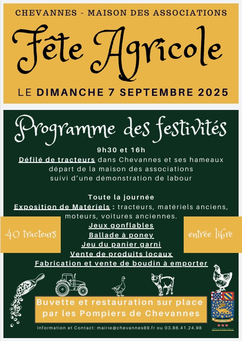 La commune de Chevannes organise sa première fête agricole sur la journée du dimanche 7 Septembre 2025, avec un concours de labour, la présence d'une trentaine d'exposants dont la S.M.A., vente de produits locaux, exposition de voitures anciennes et de matériel agricole d'hier et d'aujourd'hui...